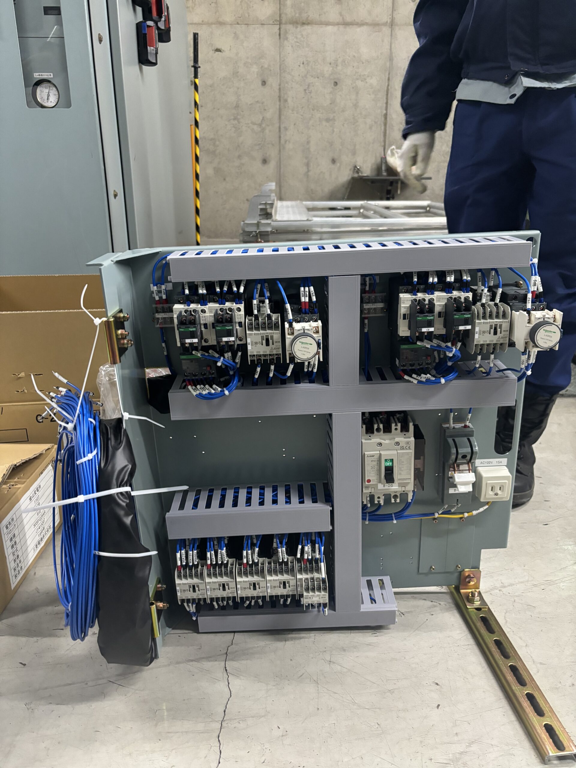 今回は33kvのLEXYの電装品を行いました。前回は補助として行わせてもらいましたが、今回はメインで作業を行いました。最初に警報を外しと一緒にDC、ACの電源を切り離しておきます。この切り離す場所は狭いので短絡、地絡に気を付けながら切り離し