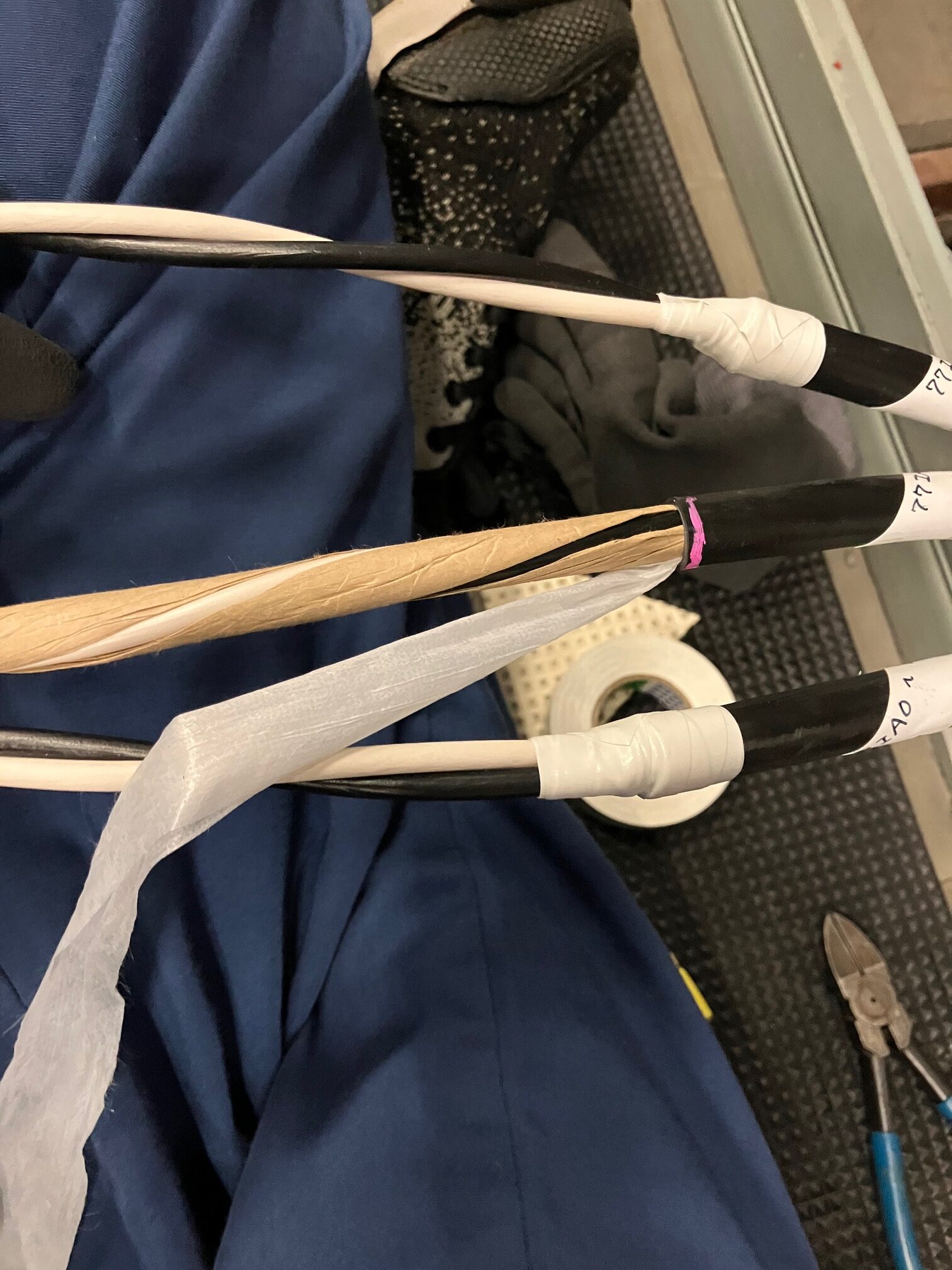 今回は、変電所の所内変圧器増設工事で、アルミ架線の圧縮をして来ました。作業前に陶器製の碍子を碍子マットで養生してから作業に取り掛かりました。 最初に、仮止めして長さを見て、番線で開き止めをして切断しました。切断後、端子に挿して軽く圧縮をし