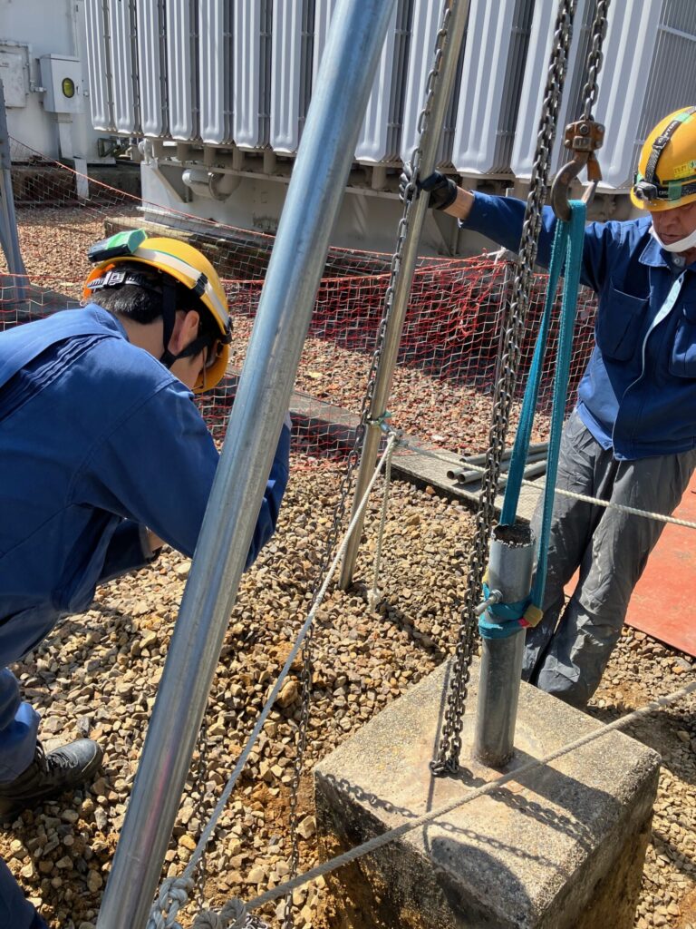 今回は、某変電所でアレスターとフェンスの撤去をしました。アレスターはバラして終わりだったのですが、フェンスの方は土台のブロックも撤去との事で、フェンスをバラしたら、ブロックを吊り上げるのに余分な支柱を切断してから撤去しました。